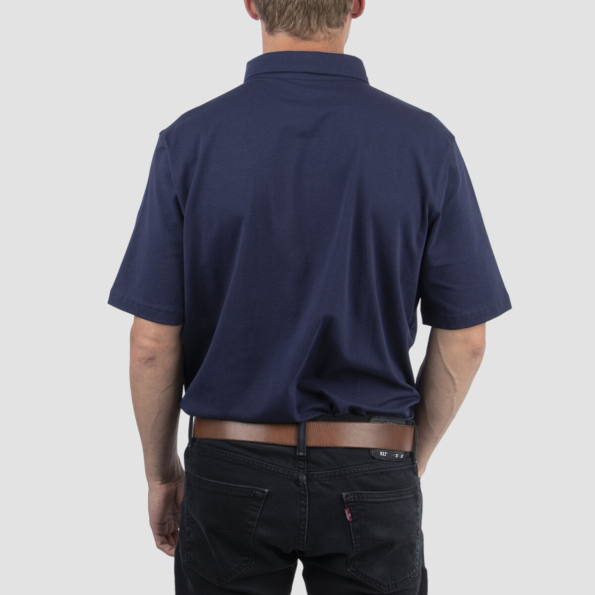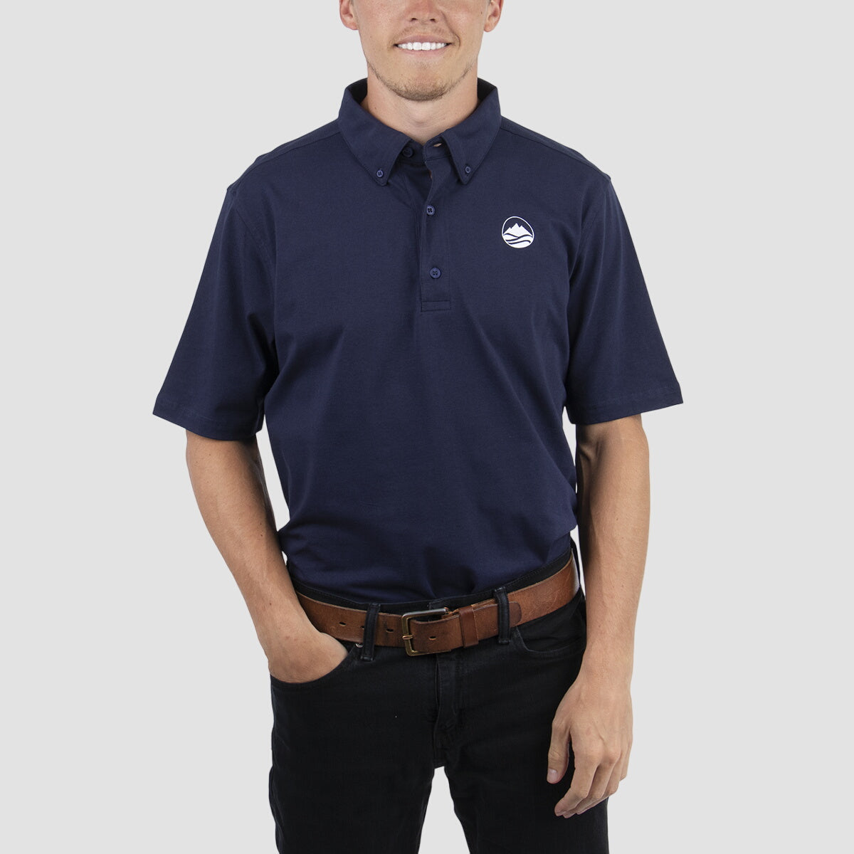 5.9 oz. 92% cotton, 8% spandex jersey. Moisture-wicking and antimicrobial performance. Self-fabric button-down collar with integrated collar stays. Three-button placket with dyed-to-match buttons. Side vents. Stretch performance. Active fit. Easy care.